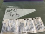 And, because they’re not wholly intuitive to use, I write some very brief directions on each strip of Aquatabs. Each strip contains ten tablets. I put one strip in each Goldilocks kit. Ten tablets yields 8 quarts of treated water. Finally, because not everyone will find themselves stranded with a water bottle, I include a quart-sized Ziplock bag. The bag can comfortably hold enough water for one tablet to purify.