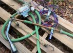 The core of this shower was a twelve-volt impeller-type pump fitted with garden hose male fittings for both the inlet and outlet ports. I made up a set of electrical leads from stranded 12-gauge copper wire and included a single-pole switch around the quarter-length mark since this type of pump will burn out if it dead heads (meaning the impeller spins but flow is stopped by an upstream closed valve). These little transfer pumps are great for moving water but their design precludes having a built-in pressure switch. I terminated the feed ends with spring-type battery clamps and made hard connections at the pump using crimped butt splices.