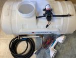 My most recent portable shower design came after I noticed a sale placard leaving Tractor Supply several years ago. It was late fall and in the entrance of the store there were a bunch of 13-gallon spray tanks such as one would mount on an ATV. Looking at the pump on one of these units, it had an obvious built-in pressure sensor. Inclusion of this feature overcomes the dead head risk associated with the transfer pump on my original shower and negates the necessity of an external switch to control the water flow. I have since learned that robust versions this diaphragm-type pump are standard equipment for camper trailers and RVs with Shurflo likely being the best-known manufacturer.